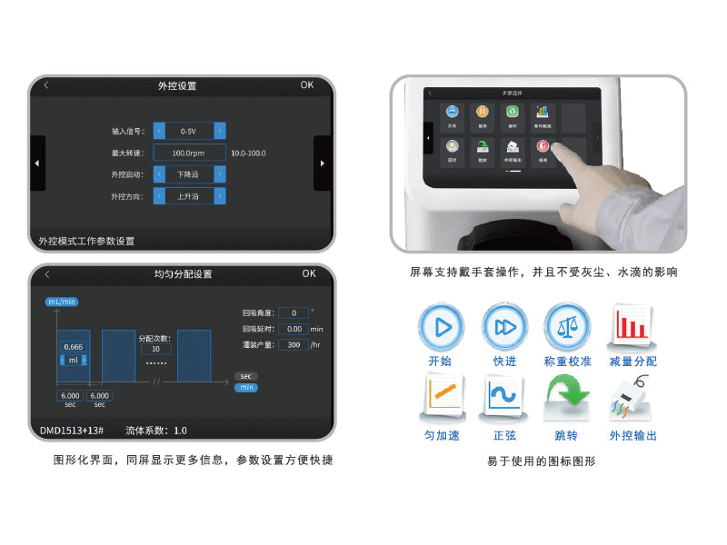 具有觸摸屏,腳踏開關,模擬量信號,通信等多種控制方式,結合多種接口(USB,RJ11,DB9等)