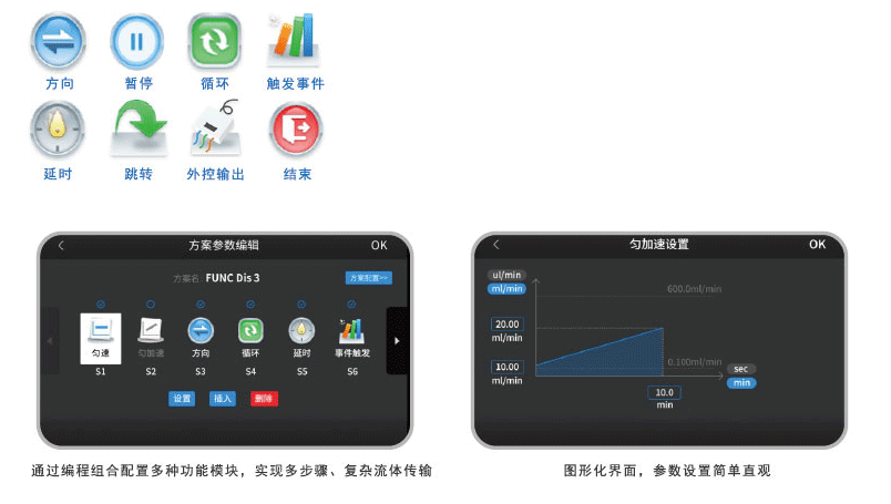· 提供9種運行控制模塊:勻速、勻加速、勻減速、階梯加速、階梯減速、正弦、均勻分配、增量分配、減量分配