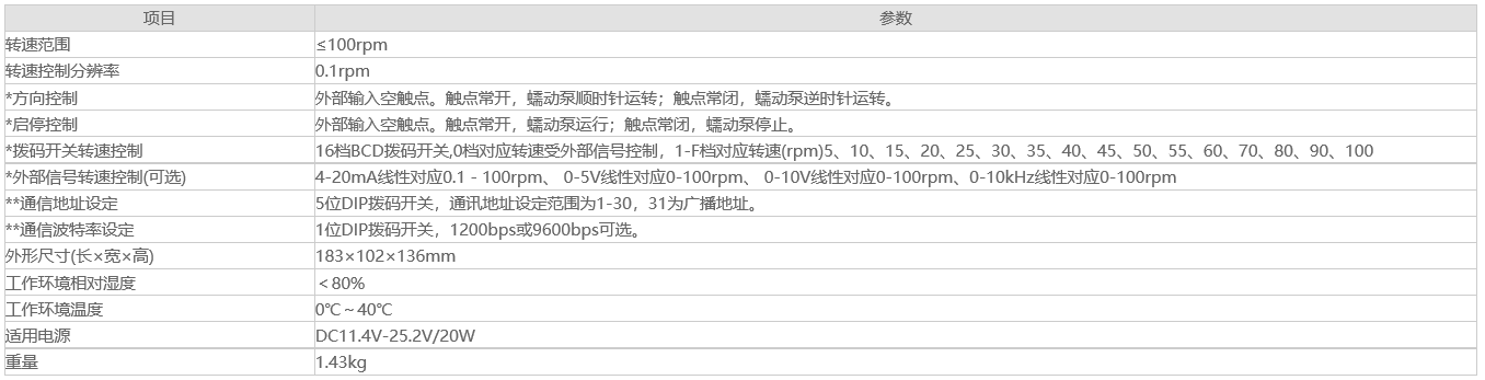 T100系列ODM蠕動泵驅動器由57步進電機選配多種控制方式形成的體積小、結構簡單、控制簡便的蠕動泵驅動器產品系列。主要在設備、儀器中配套使用,實現430mL/min以下的流體傳輸。采用撥碼開關結合外部信號的控制方式,外部信號可選4-20mA、0-5V、0-10V、0-10kHz,并可提供采用RS485通訊控制方式的產品。采用底板、面板兼容的安裝方式。