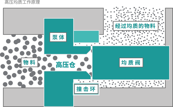 物料由物料杯經(jīng)單向閥進(jìn)入高壓倉(cāng),通過(guò)泵體伸縮加壓使樣品達(dá)到所調(diào)節(jié)控制的高壓下,通過(guò)特定寬度的限流縫隙瞬間釋放形成微射流撞擊沖擊閥或均質(zhì)閥上,依次經(jīng)過(guò)空穴、撞擊、剪切的作用來(lái)達(dá)到物料的乳化分散和細(xì)胞粉碎機(jī)的目的。