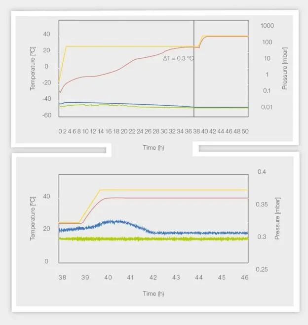 另,下圖中的頂部線(xiàn)顯示 37 小時(shí)后到達(dá)終點(diǎn)。此時(shí),溫度曲線(xiàn)和壓力曲線(xiàn)在循環(huán)轉(zhuǎn)換為二級(jí)干燥之前同時(shí)合并。