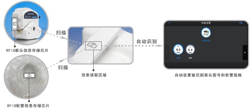 新推出的三款智能蠕動泵具有“泵頭和軟管型號自動識別”功能。通過RFID技術,泵可自動讀取泵頭型號和軟管規格信息,并在運行方案中設置相應參數。不僅幫助客戶簡化操作過程,提高工作效率,而且能夠有效保證泵頭與軟管參數的正確性,為實現高精度的流體傳輸提供有力支持。