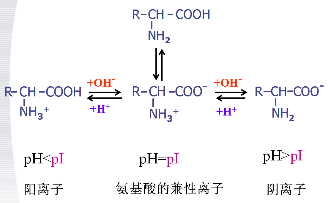 蛋白質(zhì)的等電點( isoelectric point, pI) 當(dāng)?shù)鞍踪|(zhì)溶液處于某一pH時,蛋白質(zhì)解離成正、負(fù)離子的趨勢相等,即成為兼性離子,凈電荷為零,此時溶液的pH稱為蛋白質(zhì)的等電點。