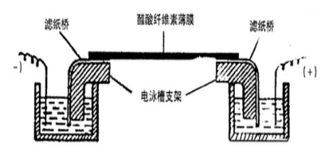 以醋酸纖維制成的薄膜作為支撐體的電泳稱為薄膜電泳。 醋酸纖維是纖維素的醋酸酯,由纖維素的羥基經乙酰化而成。 將之溶于丙酮等有機溶劑中,即可涂布成均一細密的微孔薄膜, 厚度約以0.1-0.15mm為宜。 醋酸纖維素薄膜與濾紙相比較,有以下優點: